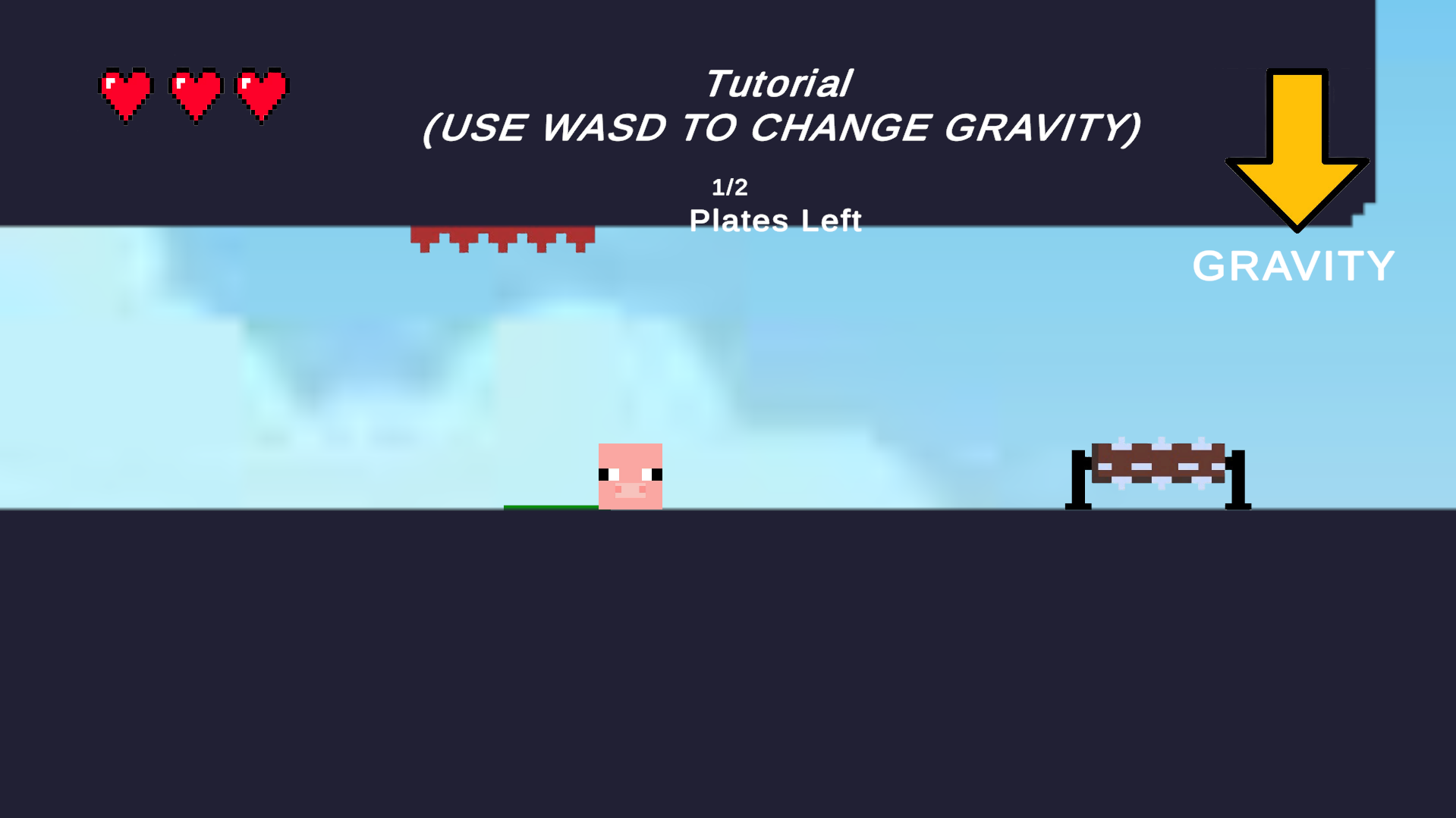 In this 2D gravity-based arcade game, you control a square-shaped player that moves through a world filled with obstacles and hazards. Instead of traditional movement, you shift gravity in four directions (up, down, left, right) to navigate the environment. The square bounces off walls with physics-based reactions, so timing and precision are key. You begin with 3 lives, shown as hearts on the UI, and each collision with an obstacle costs one life with a hit sound effect. Once all lives are lost, the game restarts. A simple background theme and a UI gravity arrow guide your movements, creating a challenging but fun experience.